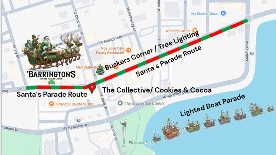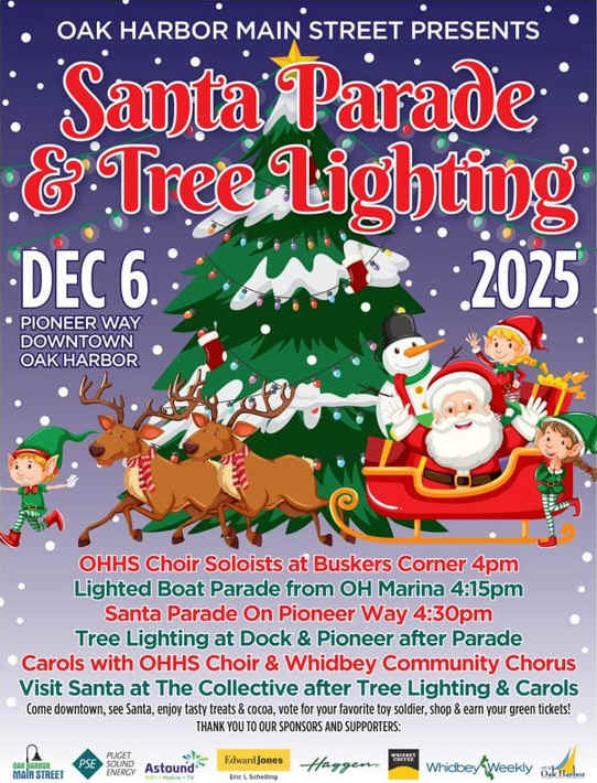 4:00–4:30 PM : Carolers strolling along Pioneer Way and the Lighted Boat Parade sparkling in Oak Harbor.