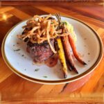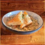 Nine ounces of grilled steak, topped with garlic butter and onion straws. Served with seasonal vegetable and choice of mashed potatoes, colcannon mashed potatoes, or English “chips”.